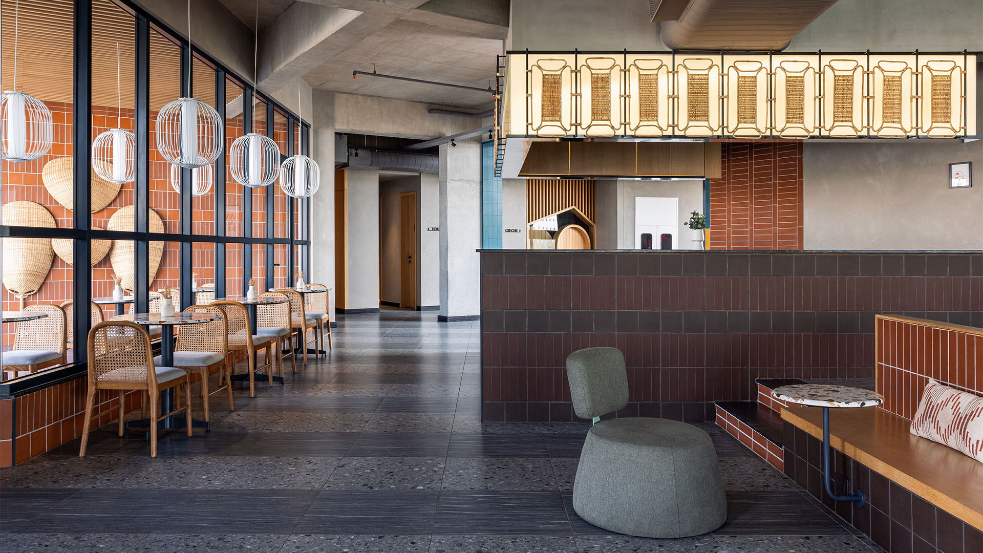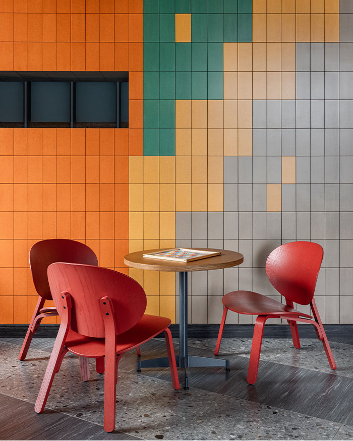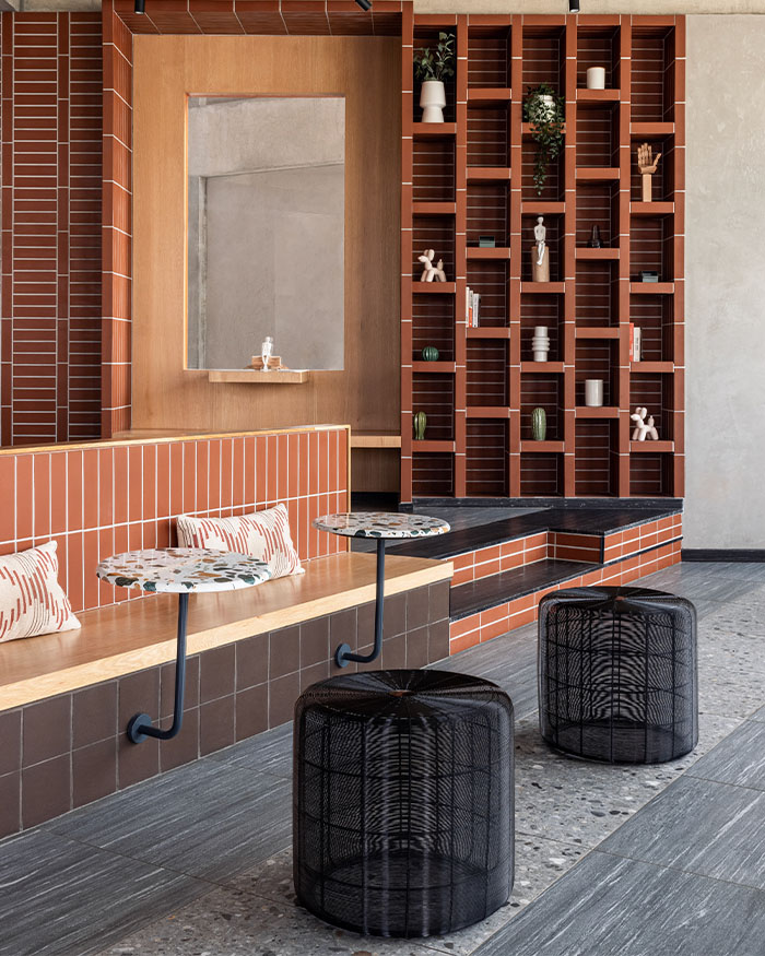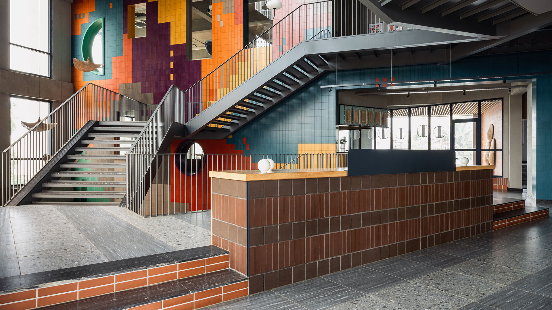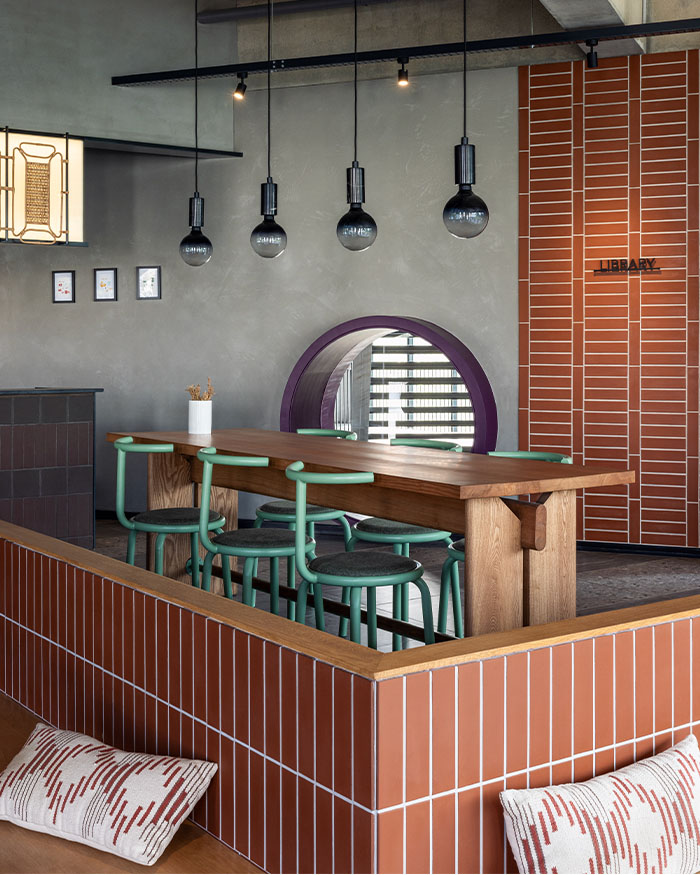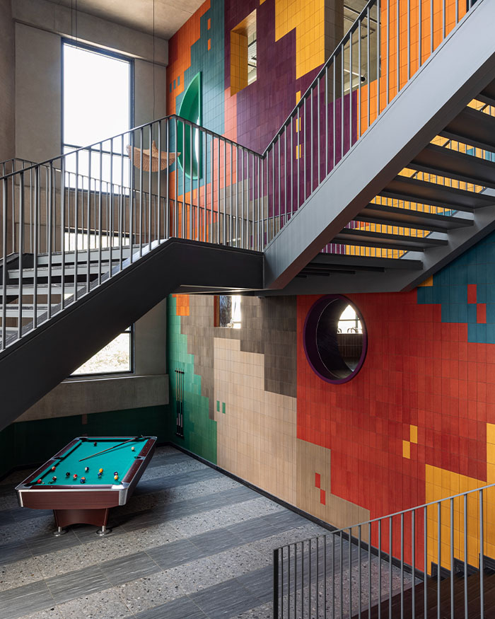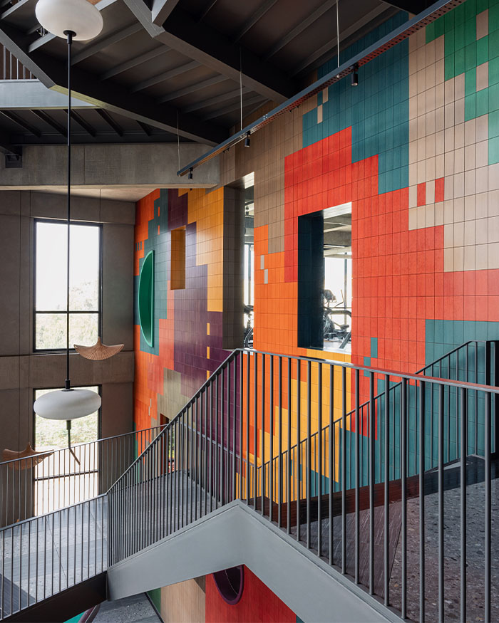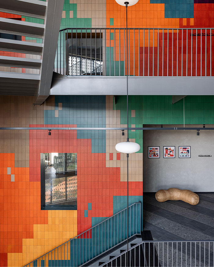 Ankur explains, “The colour palette is bold yet warm, with solid-core Valchromat wood panels forming the pixelated mural that spans all floors, injecting colour into the otherwise industrial shell.” Around it, an earthy mix of concrete, brick, and stone sets the tone. “An earthy palette of robust, cost-effective, and low-maintenance materials such as concrete, brick, and stone maintains a contrast between the stark shell and distinct stylistic interventions that are part of the design scheme,” he adds.