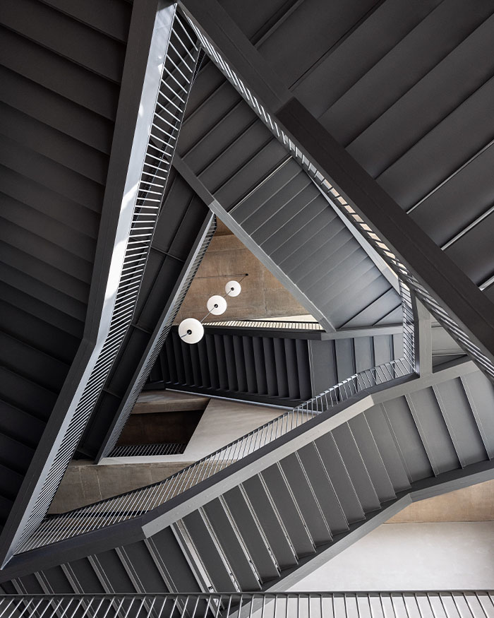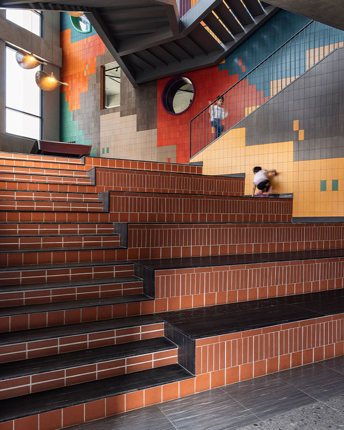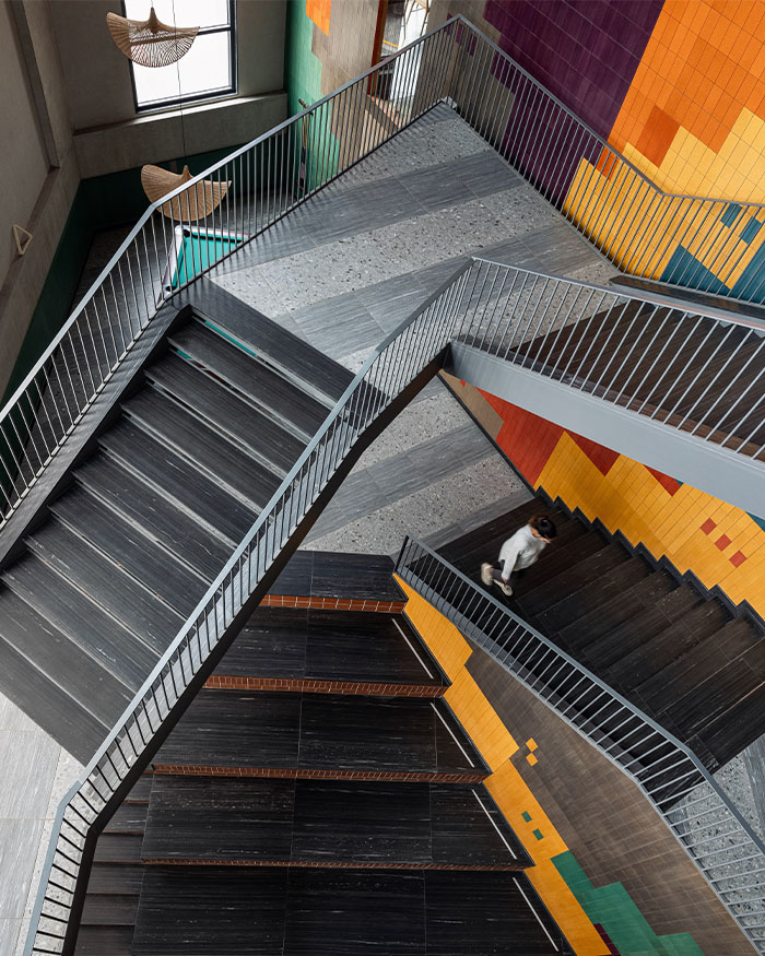 That decision reshaped everything. “Hollowing out the core gave us a vertical expanse to play with,” he tells us. What emerged was a dramatic four-storey atrium tied together by a steel staircase and a vibrant mural. Two elements that became narrative and programmatic anchors, stitching together circulation, visibility and engagement across levels. As the staircase weaves through the volume, bridges and mezzanines branch off into zones for play, rest, and conversation. Openings in the mural wall allow glimpses from one level to another, turning movement into performance.