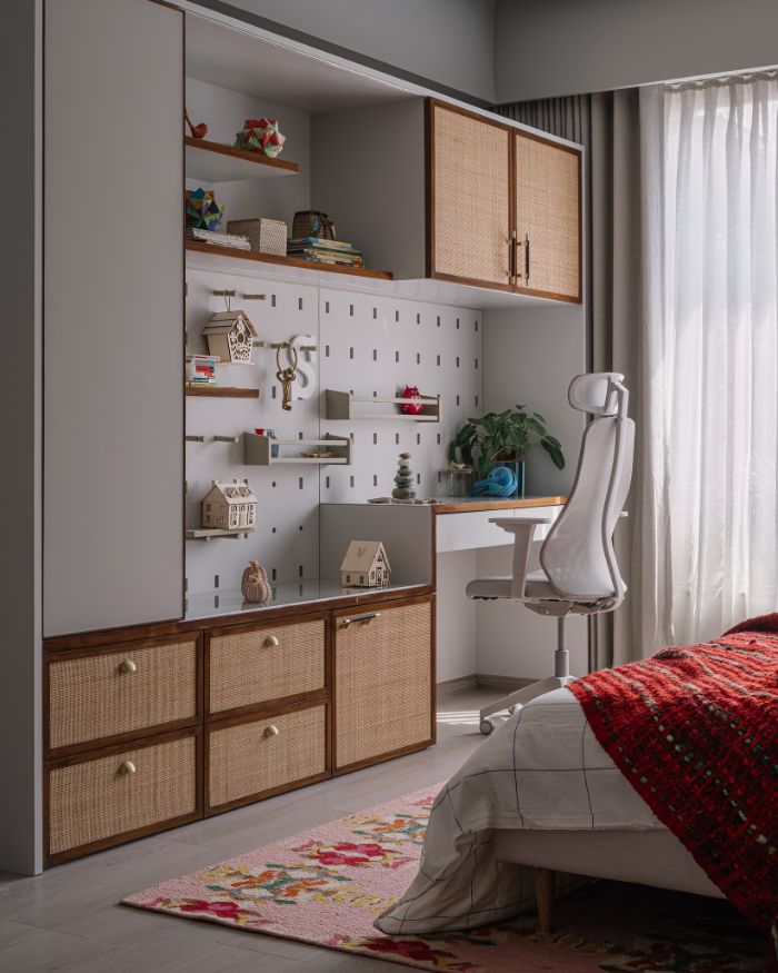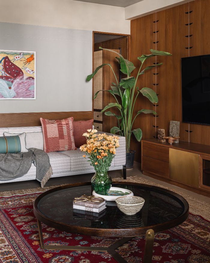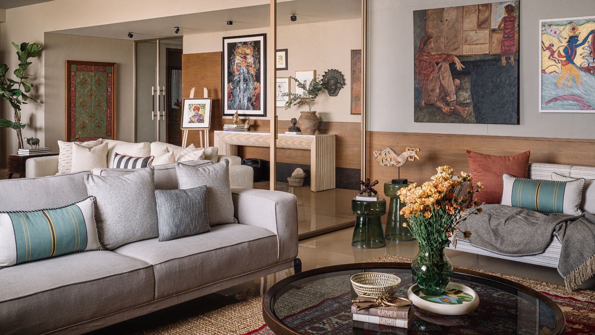 Art is never simply decoration; it’s also an amalgamation of stories and memories. In a home that defines itself by artistic interventions, this space is a visual experience. Built by Studio Patternmaker’s Principal Designer, Parthavi Patel, the 3,000 sq ft home in Ahmedabad, Gujarat co-exists with beauty. The homeowners’ desire to feel art in the space also resulted in the transformative qualities; a burst of colours, patterns and memorabilia that make the space lived-in. The home consists of the living and dining spaces, a kitchen, four bedrooms, a puja room and a terrace.