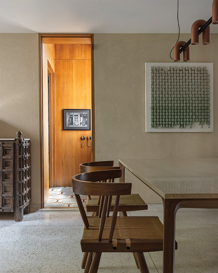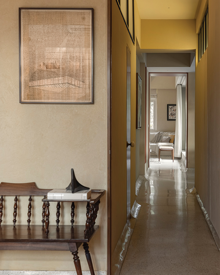 The home’s palette is a study in quiet luxury, hand-mixed marble-chip terrazzo with brass inlay and marble-dust-textured walls. Each material carries a memory — some inherited, some newly discovered. Each design reflects thoughtful curation, like all the Mortice door knobs spotted throughout the house are sourced from Yorkshire Ironworks, a historic foundry in Birmingham. The designers’ favourite detail is the vata skirting that runs like a whispered footnote through corners, corridors and balconies, binding the home into a single book.