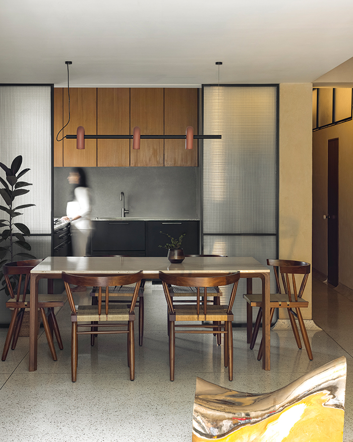 To the right, the kitchen is positioned behind frosted waffle-glass panels. The black cabinetry and grey stone surfaces alongside a heirloom coffee bar maintain a serene visual field, enabling the custom-made dining table and Design Bee chairs to delineate the area. The spiral staircase, humorously referred to by the designers as “a stairway to heaven,” stands out as the most unique element of the home. It ascends gracefully along the kitchen wall, capturing attention as it leads the gaze upward, complemented by a reimagined Satish Gujral painting hung alongside it to enhance the dramatic effect of the transition.