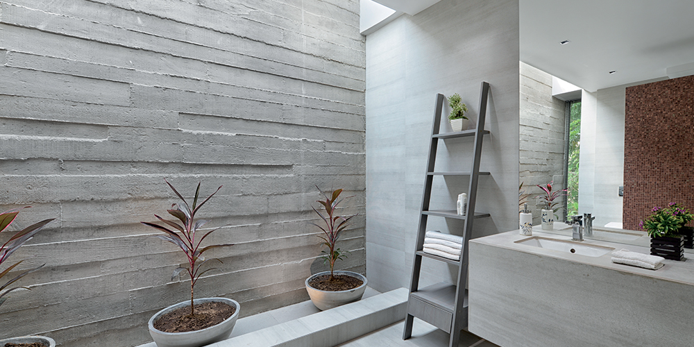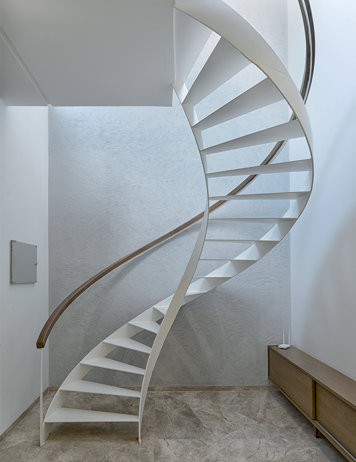 Each of the bedrooms on the first level feature dressing corners and washrooms with a skylight and niche for planters below. I always provide one-of-a-kind staircases in every home, including the two we built here. One is in concrete and wood, with a “graph” railing, while the other is a metal spiral that leads to the terrace.
