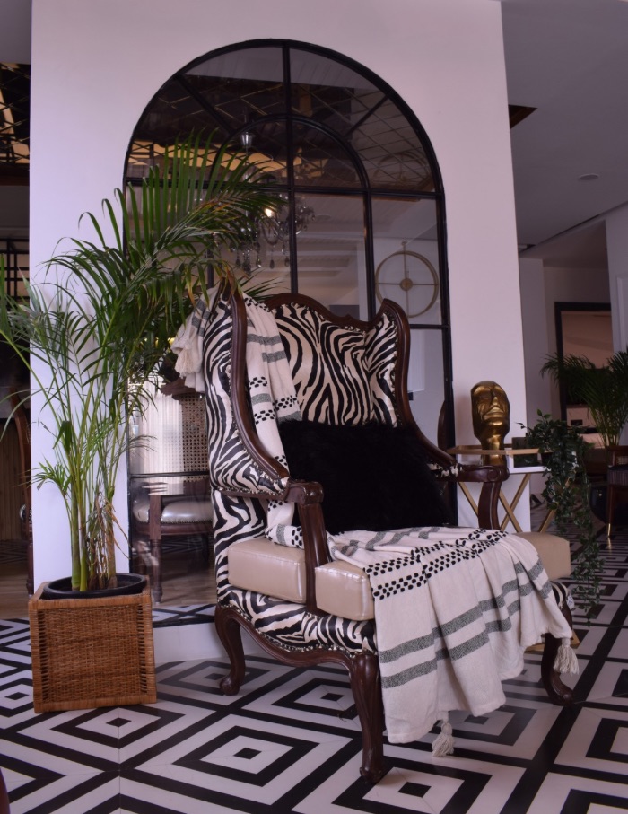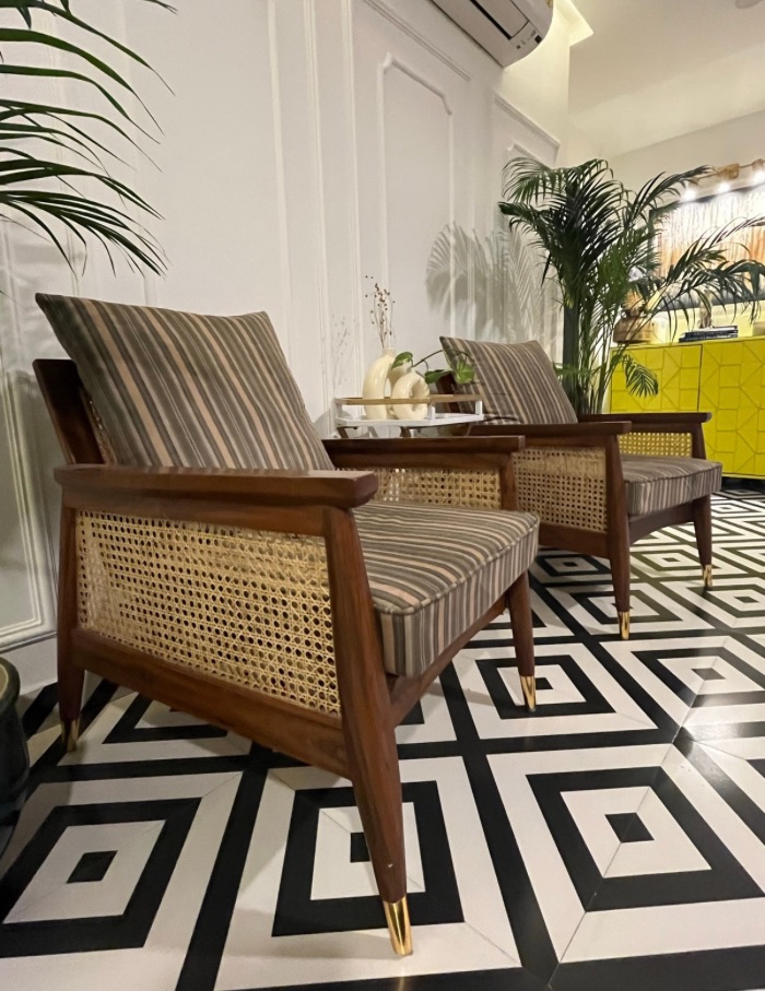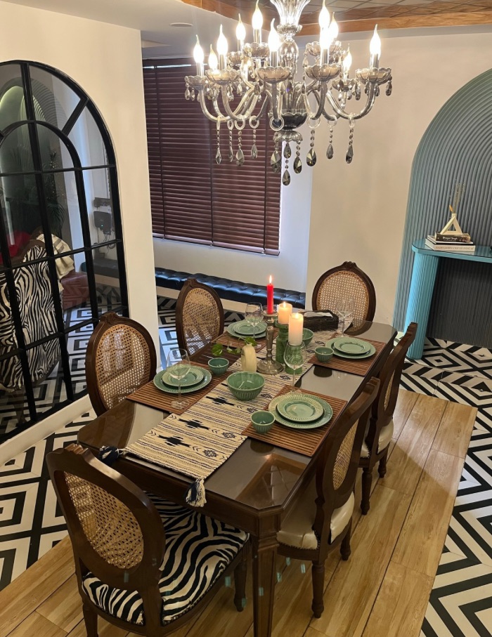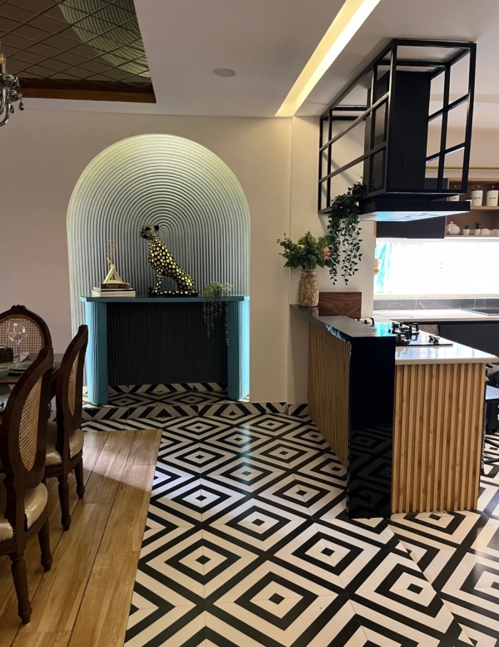 Reinventing classical designs and materials into contemporary elements is at the core of this home’s interiors. From the checkerboard floor tiles of the living room to the hand-painted artwork and statement light fixtures, the space is intended to be a visual feast.