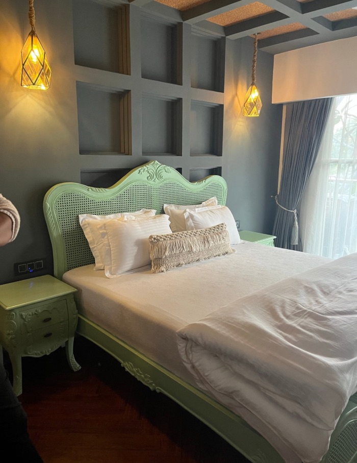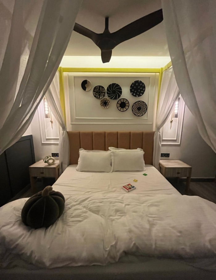 Incorporating a classical partition adorned with intricate patterns becomes an interesting way to create a sense of division without compromising on openness. The large windows flood the space with natural light during the daytime.