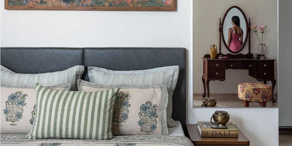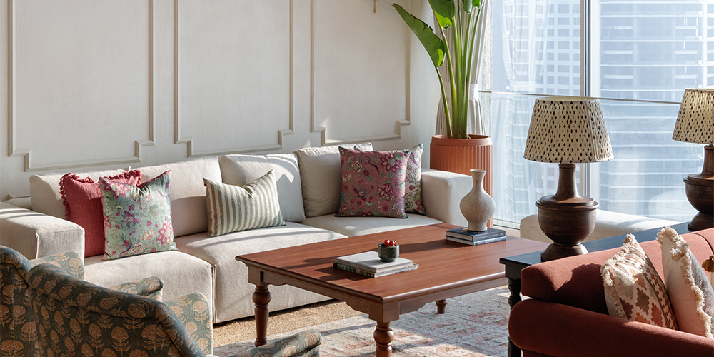 While there’s plenty to love about this airy 4,500 sq ft apartment, the breathtaking vistas of the Arabian Sea and the iconic Bandra-Worli Sea Link from the living room ranks on top of the list. The striking Sabyasachi fabric at the entryway, elevated as a dramatic piece of art that sets the tone for this carefully curated home, comes a close second.