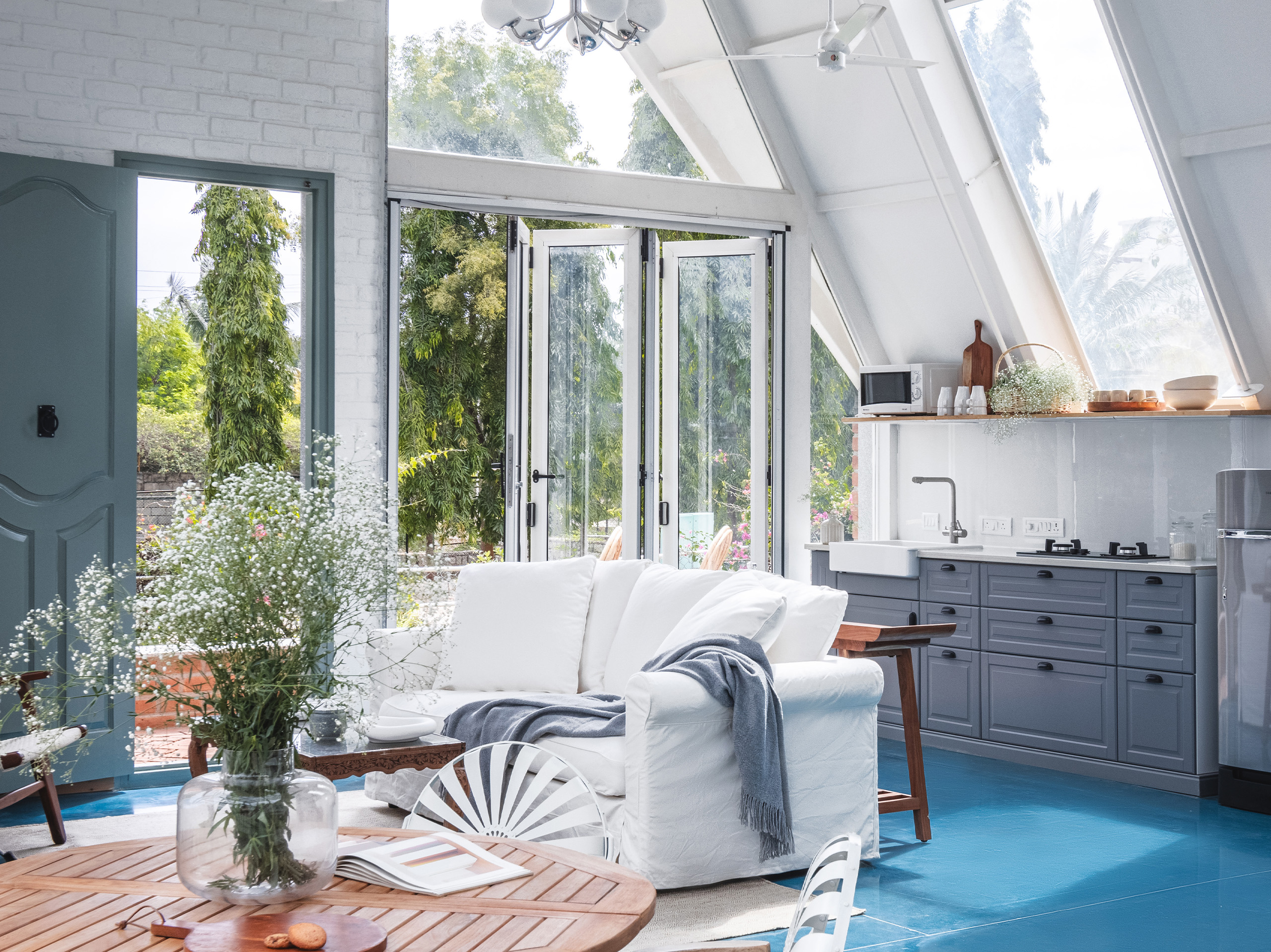 The space draped in blue and white hues features a sculptural light fixture at the teakwood oval extendable dining table from Beruru, a kitchenette cabinet and a sofa from IKEA. Skylights are from Local Objects; Photography by Jubin Johnson