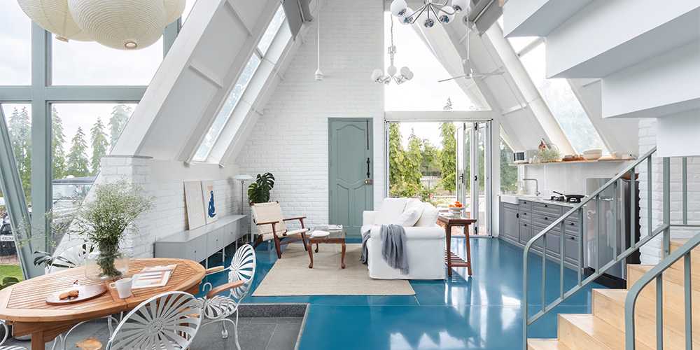 Inside, the space unfolds with an effortless flow, blending the living room, kitchenette, and dining courtyard into a harmonious space. Cobalt blue micro-concrete floors and brick walls painted in white create a canvas for relaxation and creativity, while the skylight bathes the space in natural light.