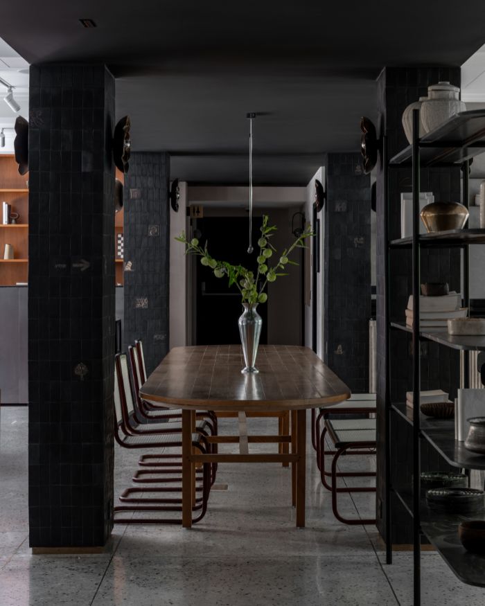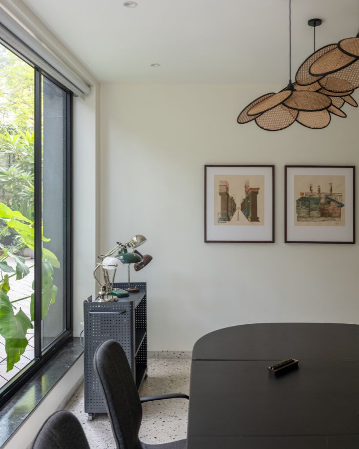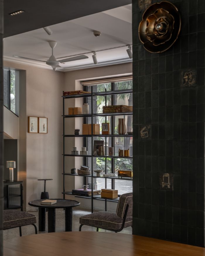 Across the structure, black leather-finish granite from Telangana grounds the palette — framing plinths, staircases and lift lobbies with a heaviness. Lime plaster walls soften everything in return. Pune has always carried a certain darkness in its palette — one that comes straight from the basalt-rich Deccan plateau it sits on; therefore, it became the anchor tone, while brass, teak and terrazzo add warmth.
