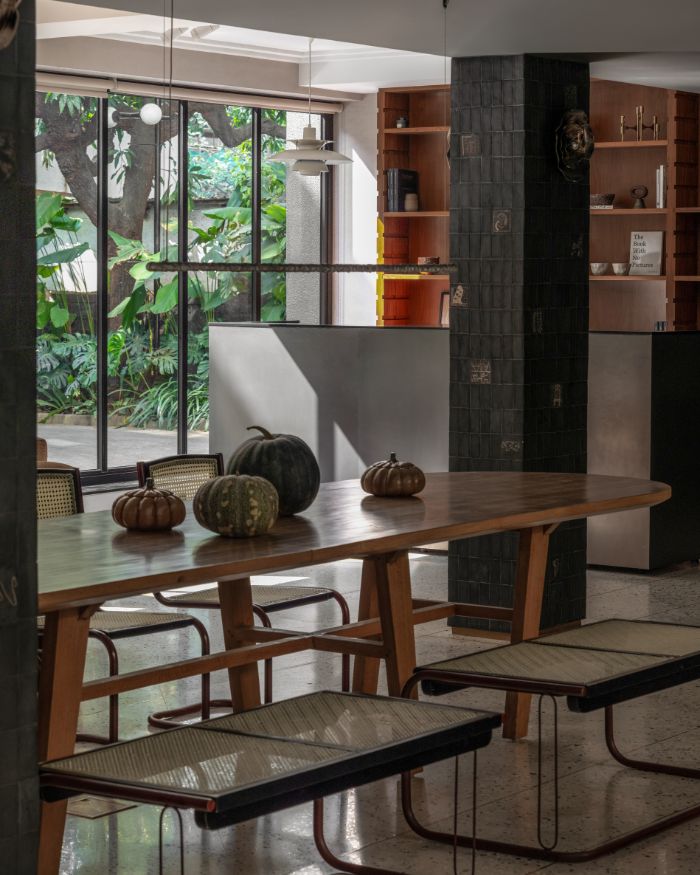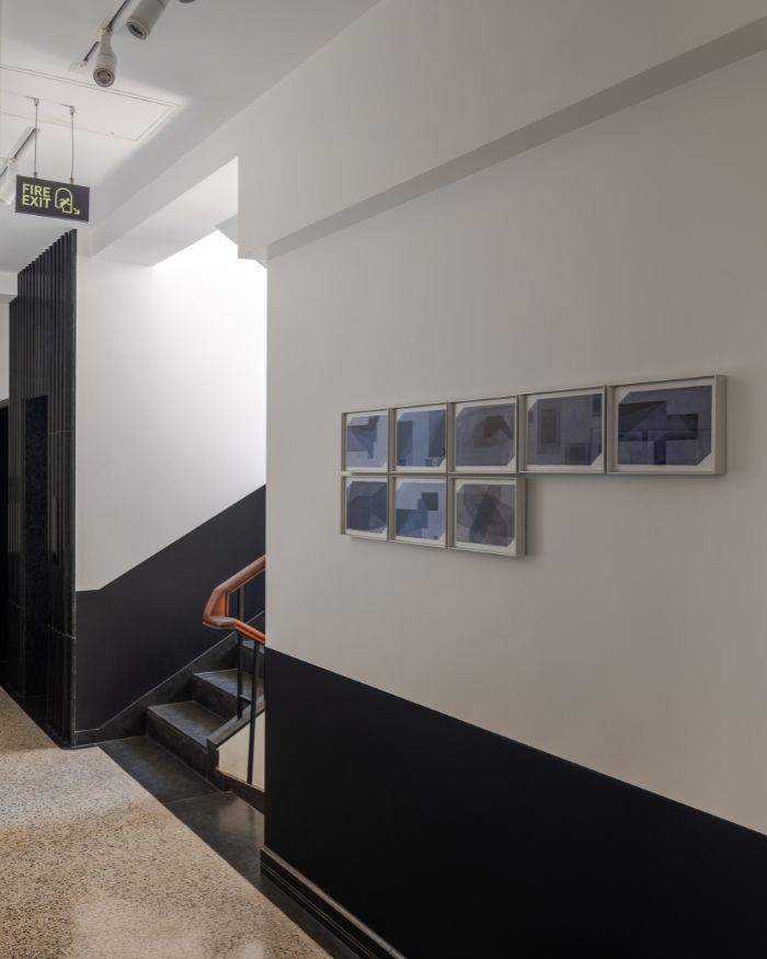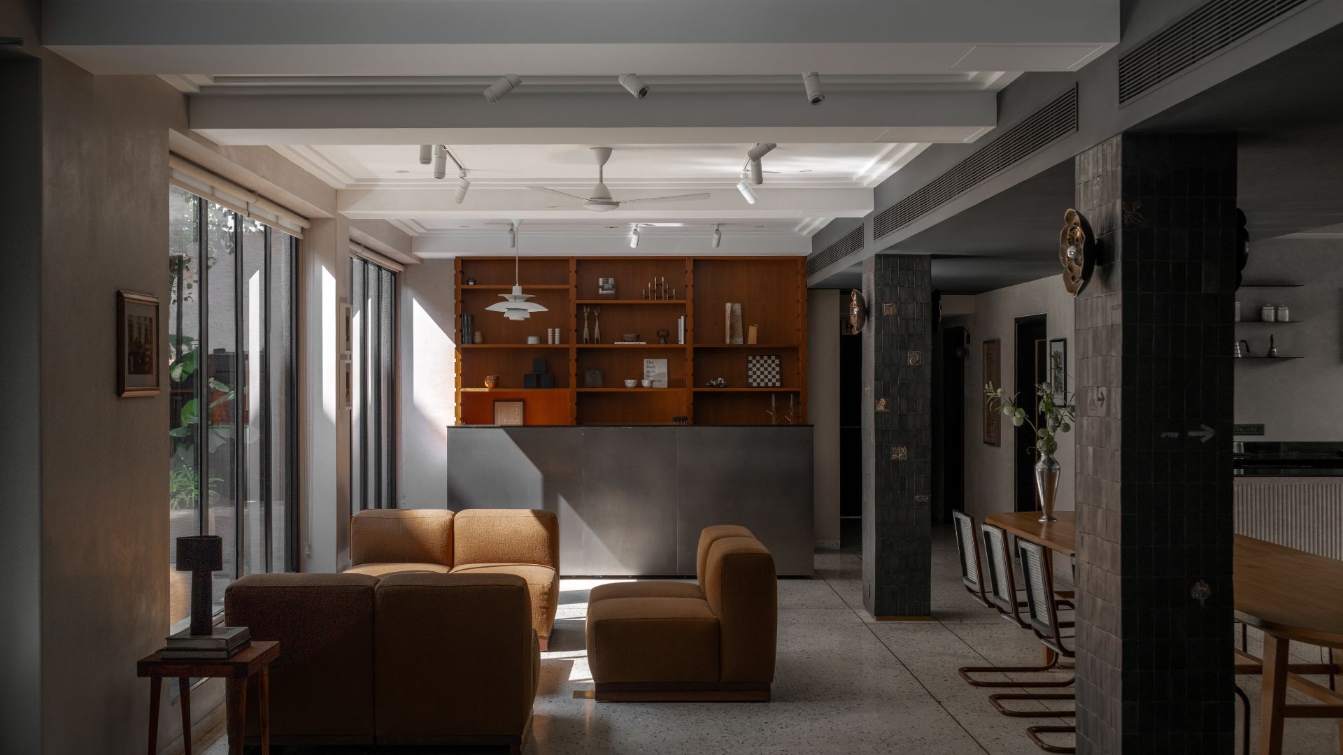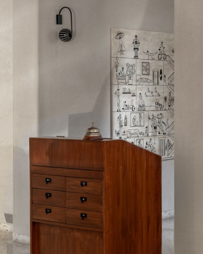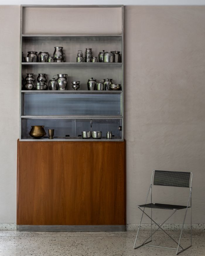 Instead of bleaching out age, this space allows its rusted tones to mingle with coeval colours. The original 1964 terrazzo was refurbished, its speckled surface carrying the essence of earlier life. Teak railings on the staircase have been retained too, their patina acting as a record of years passed.