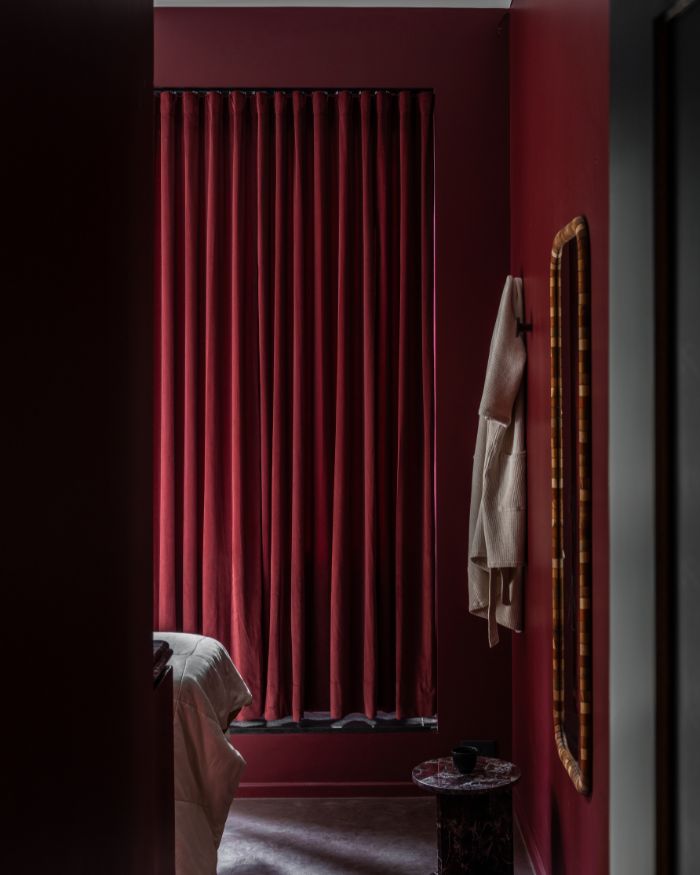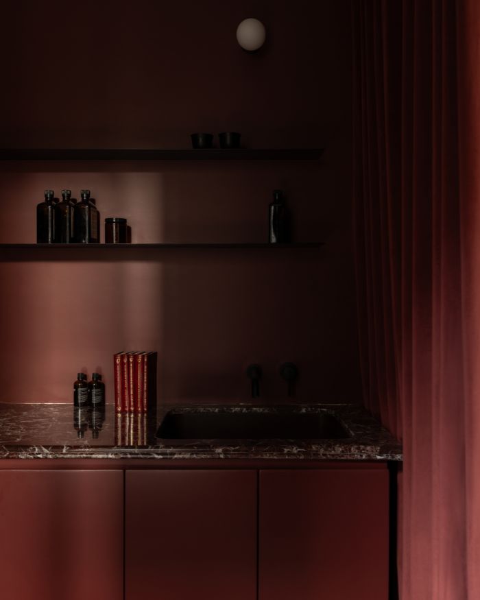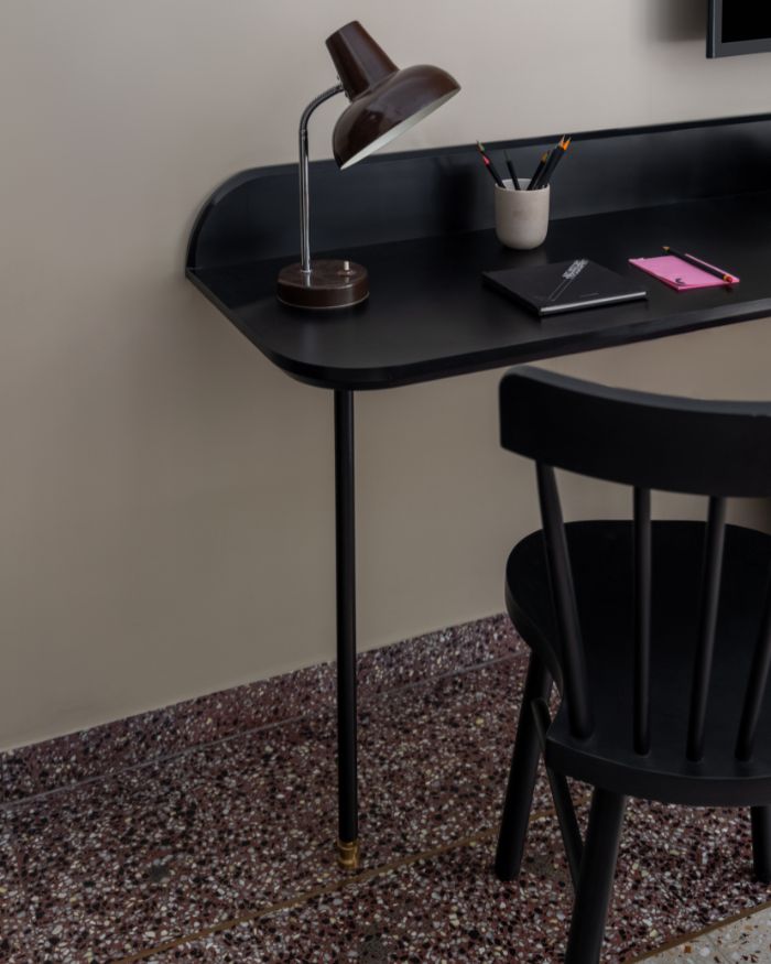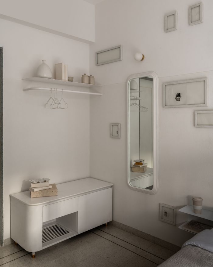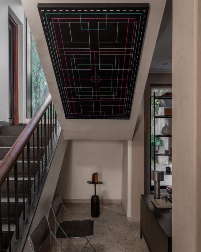 Instead of bleaching out age, this space allows its rusted tones to mingle with coeval colours. The original 1964 terrazzo was refurbished, its speckled surface carrying the essence of earlier life. Teak railings on the staircase have been retained too, their patina acting as a record of years passed.