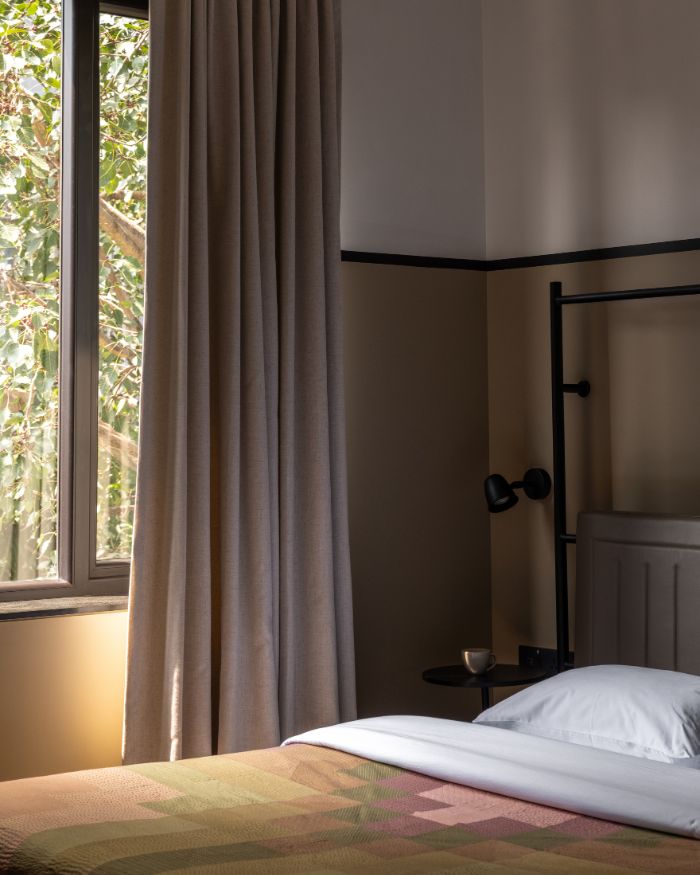 A bedroom where morning filters through leaves featuring a bedspread by Altrove; Photography by Kuber Shah