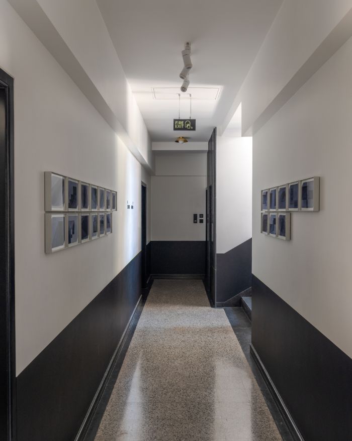 The corridor featuring art by Arvind Sundar; Photography by Kuber Shah