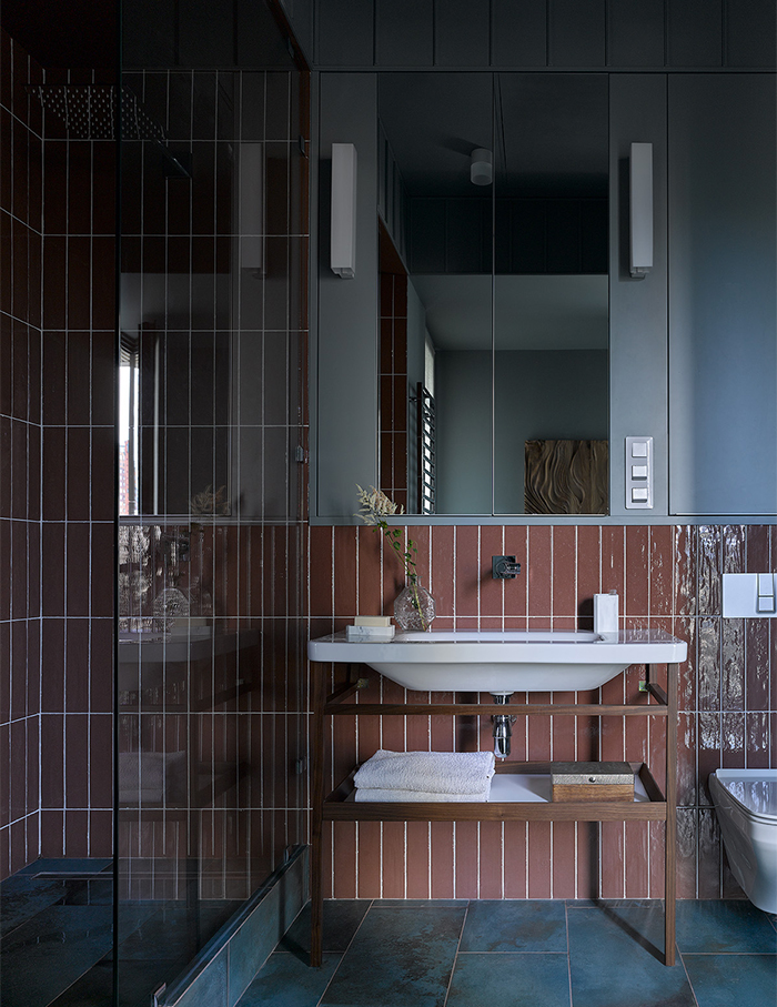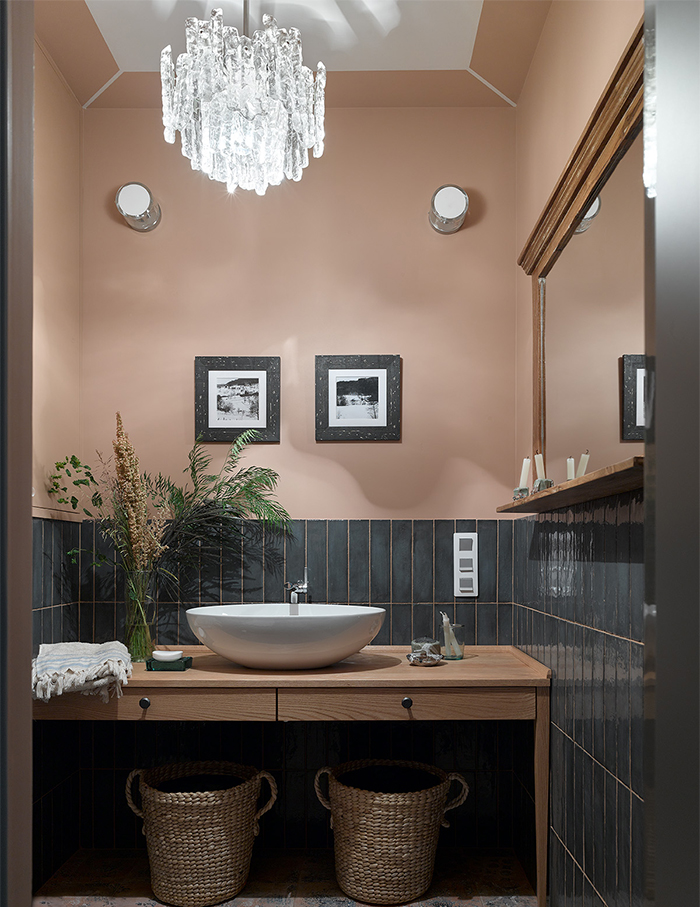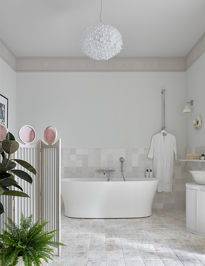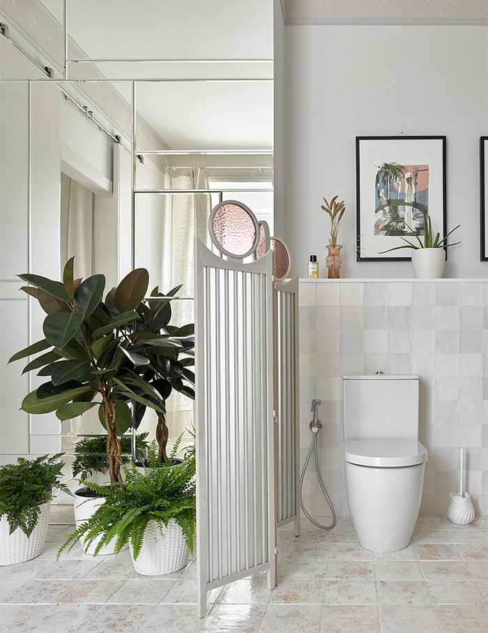 Similarly, curtains in soft shades matching the walls, and painted off-white friezes with rhythmic ornaments or floral patterns by Moscow based artist Natalia Turygina add a sense of serenity to the space. An interplay of ornate, textural and oxidised metal tiles can be seen across different surfaces in the bathroom.