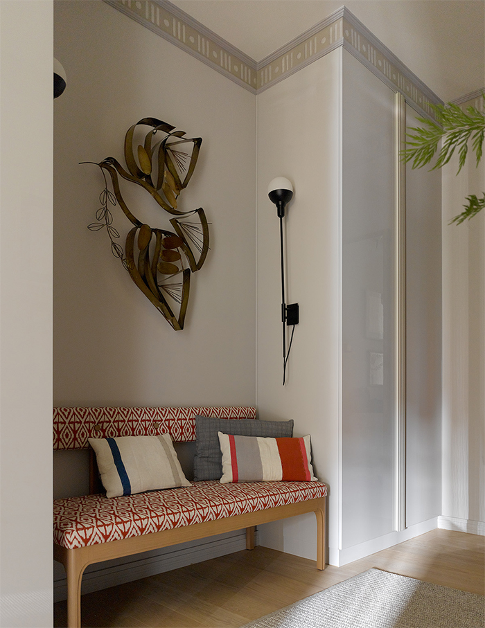 The Dove of Peace by Curtis Jere, a wall mounted sculpture, ushers visitors into the abode. A compact bench is tucked into the same niche, fashioning a cosy seating area. A tall wardrobe for street clothes and a small storage room flanks this zone. Further inside, we catch sight of an exquisite composition of birch trees that combines painting and embroidery techniques by Russian artist Anna Samoylova, exclusively crafted for this residence.