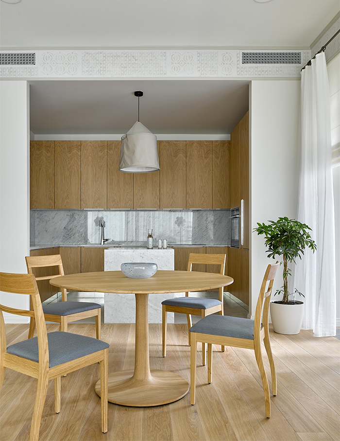 The wholesome aesthetic of the space is also a result of a trusting relationship between the designer and the clients. With similar styles, clear and well expressed-communication, and a free rein, Golavskaya was able to bring to life interiors that were minimal yet decadent.