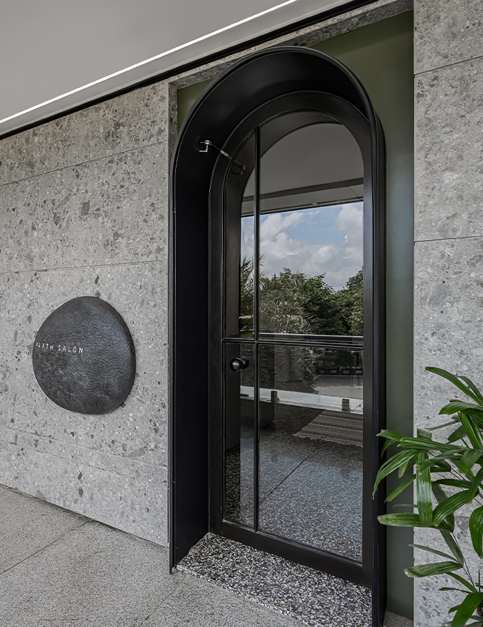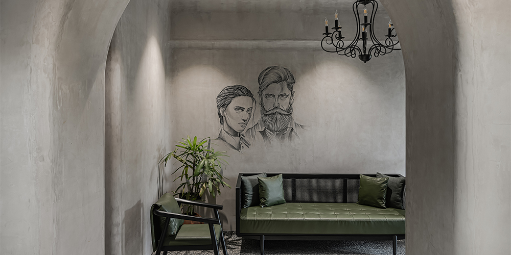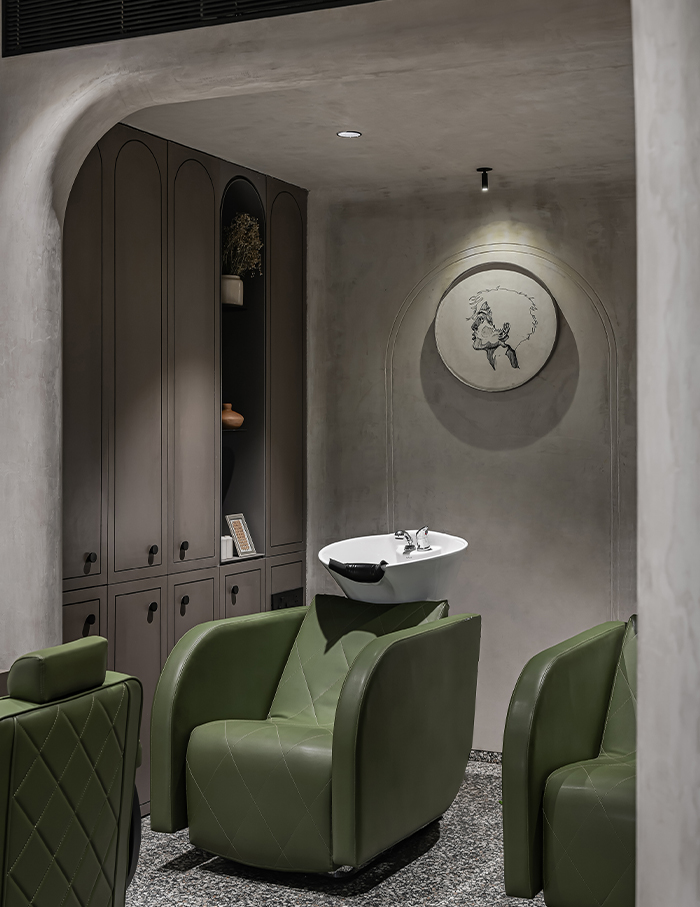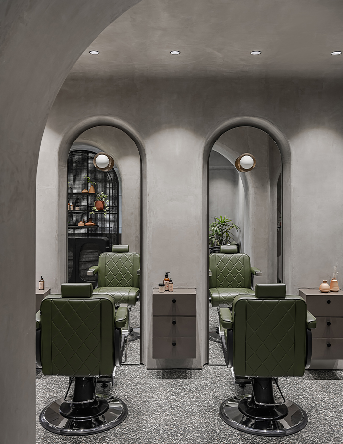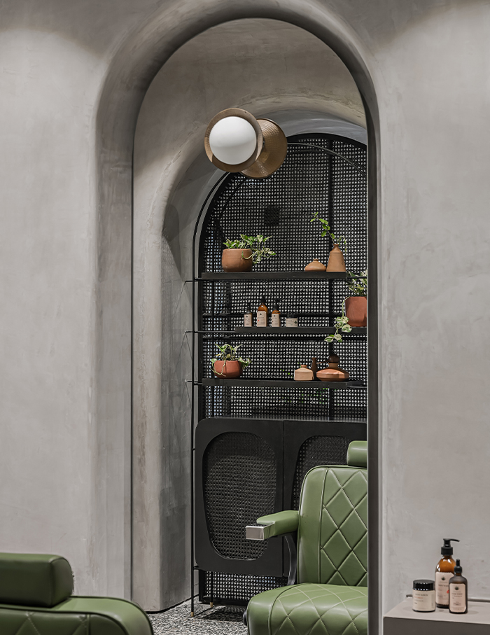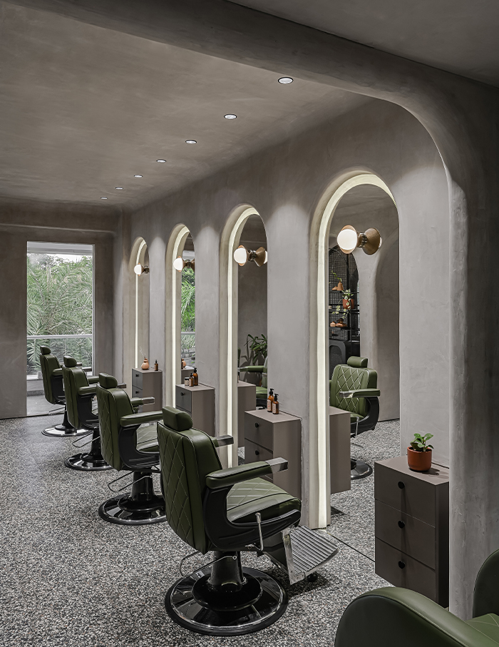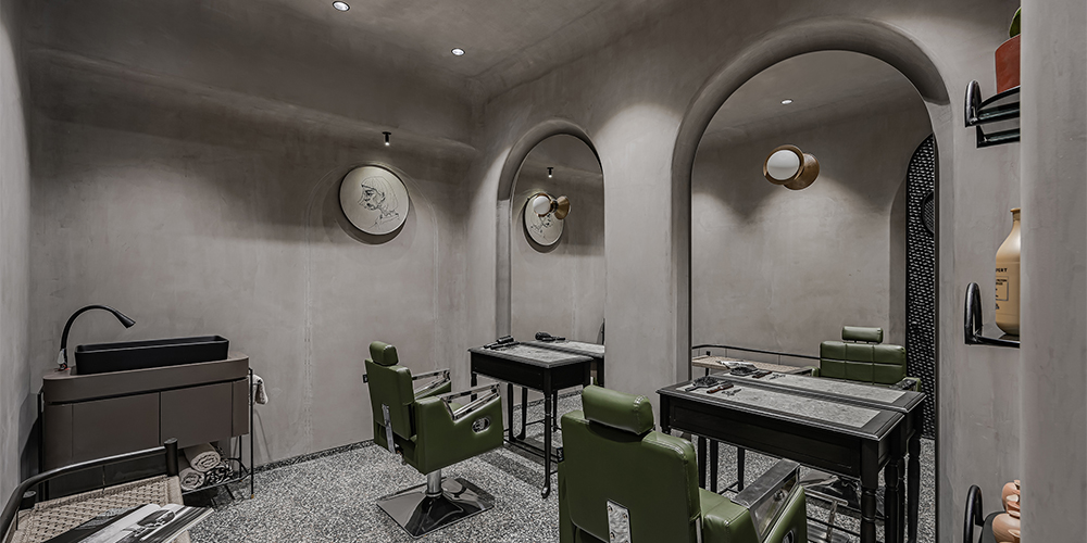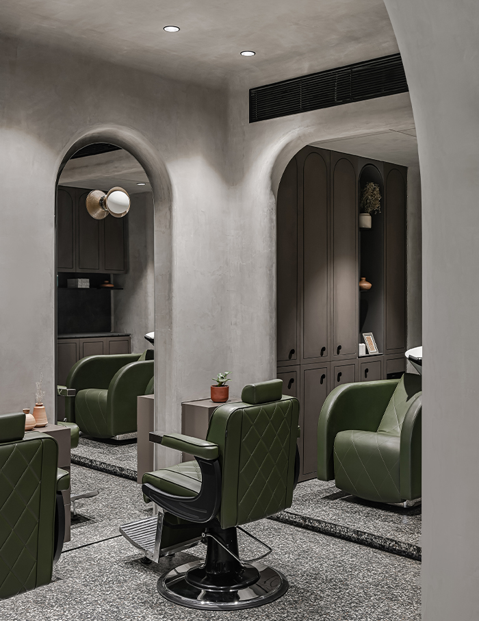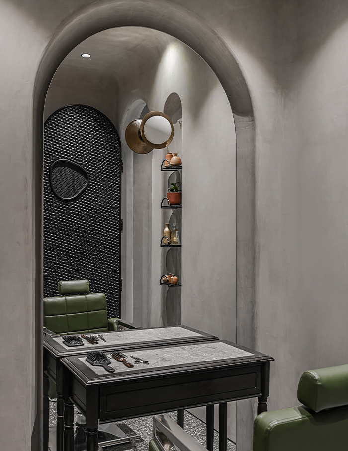 Through the arch in the reception, the male section begins. The space is designed in minimal and lowkey ways with regards to the forms and materials used. The luxurious space has aspects of Wabi Sabi with a touch of contemporary themes.
