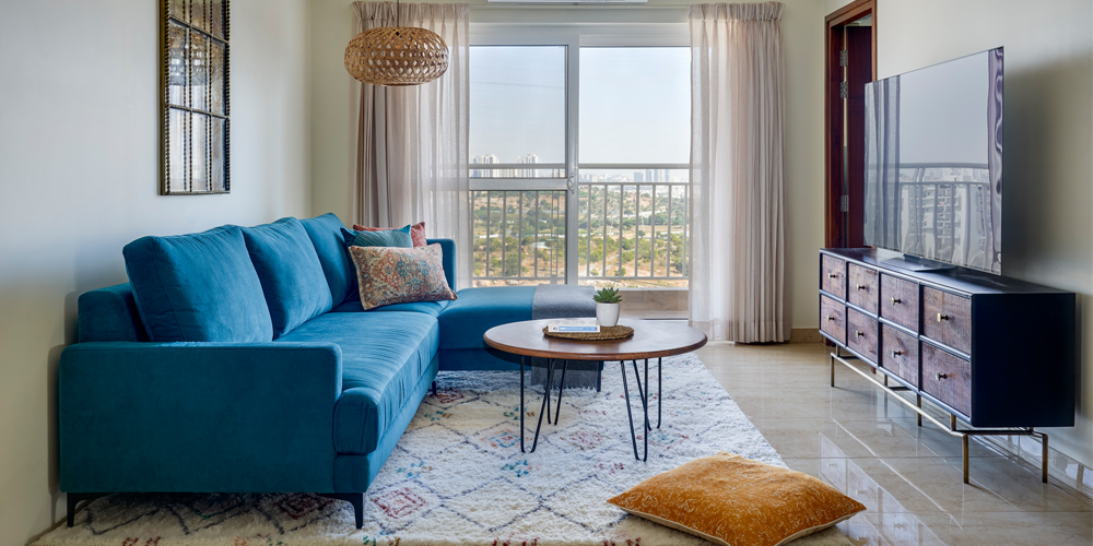A teal sectional rests on an ivory Beni Ourain inspired rug in the lounge; Photographs by Shamanth Patil J