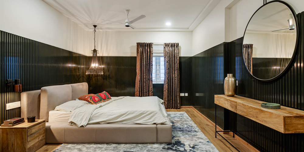 An oversized corner chandelier from The Purple Turtles highlights the black-fluted backdrop in the primary bedroom; Photographs by Shamanth Patil J
