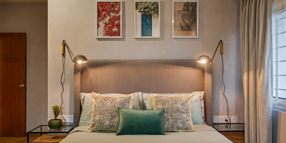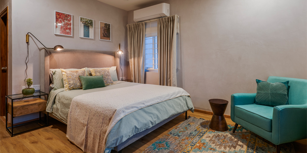 This cushy nook in the primary bedroom features a velvet seater and a distressed corner table from Chairs & Company; Photographs by Shamanth Patil J