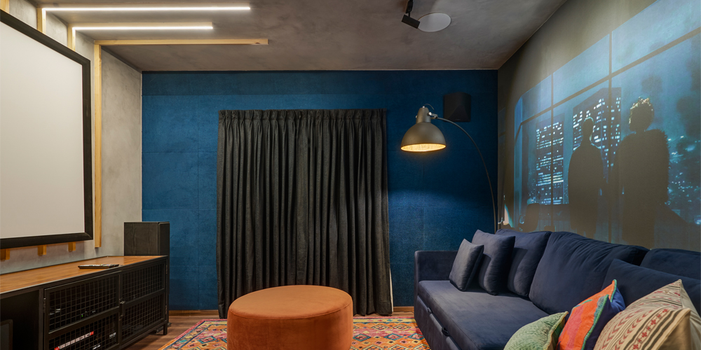 The apartment also consists of a guest bedroom in neutral tones, teak flooring and colour pops. Near it is a home theatre, which has walls lined in deep blue foam for acoustics and a concrete-finished ceiling. The entertainment zone also hones a feature mural, inspired by the the movie Fight Club, and a few customised furniture pieces.