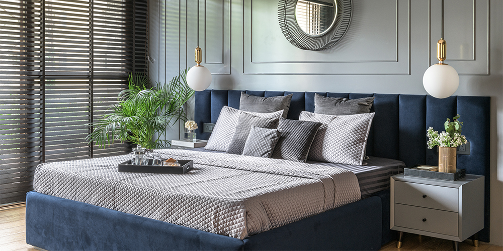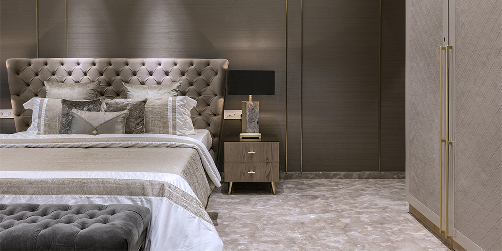 The master bedroom comes across as a subtle yet plush setting that has silk wall coverings along with inserted brass accents. Shades of taupe and grey prevail throughout the space. Sleek and visually light furniture is adopted, while the tufted winged headboard steals the limelight.