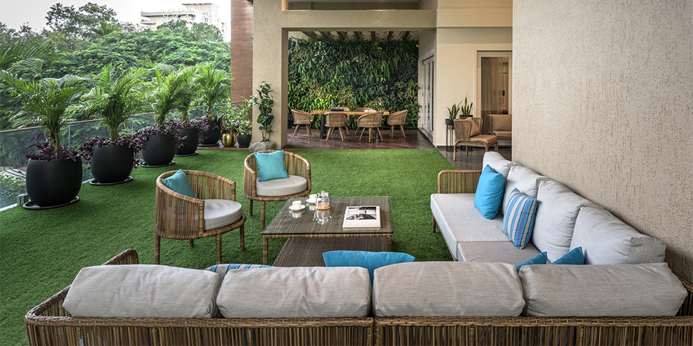 To beat the time crunch, the designers brought their A-game to the table. They went on to infuse greens wherever possible to lend a sense of freshness to the abode. We love that both living rooms open out to a terrace garden—one half of which is a family lounge with a projector screen, while the other features a wooden pergola draped with creepers and decked with outdoor rattan furniture.