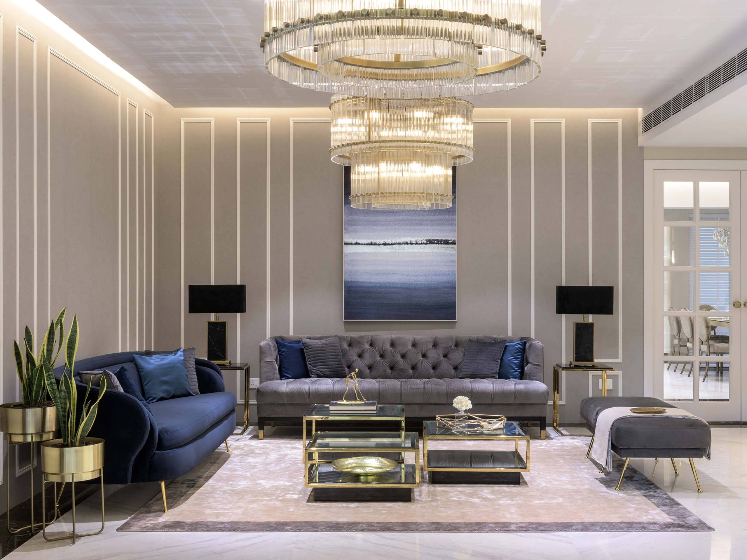 The apartment opens up to a grand formal living room at the centre. It becomes the focal point and is ideal for both private and social gatherings. The material palette has muted tones of beige and white, accentuated with vivid furniture pieces in shades of blue and grey. “This is our favourite space, where elements like blue sofas and bold statement chandeliers lift the space,” say Poonam and Akash.