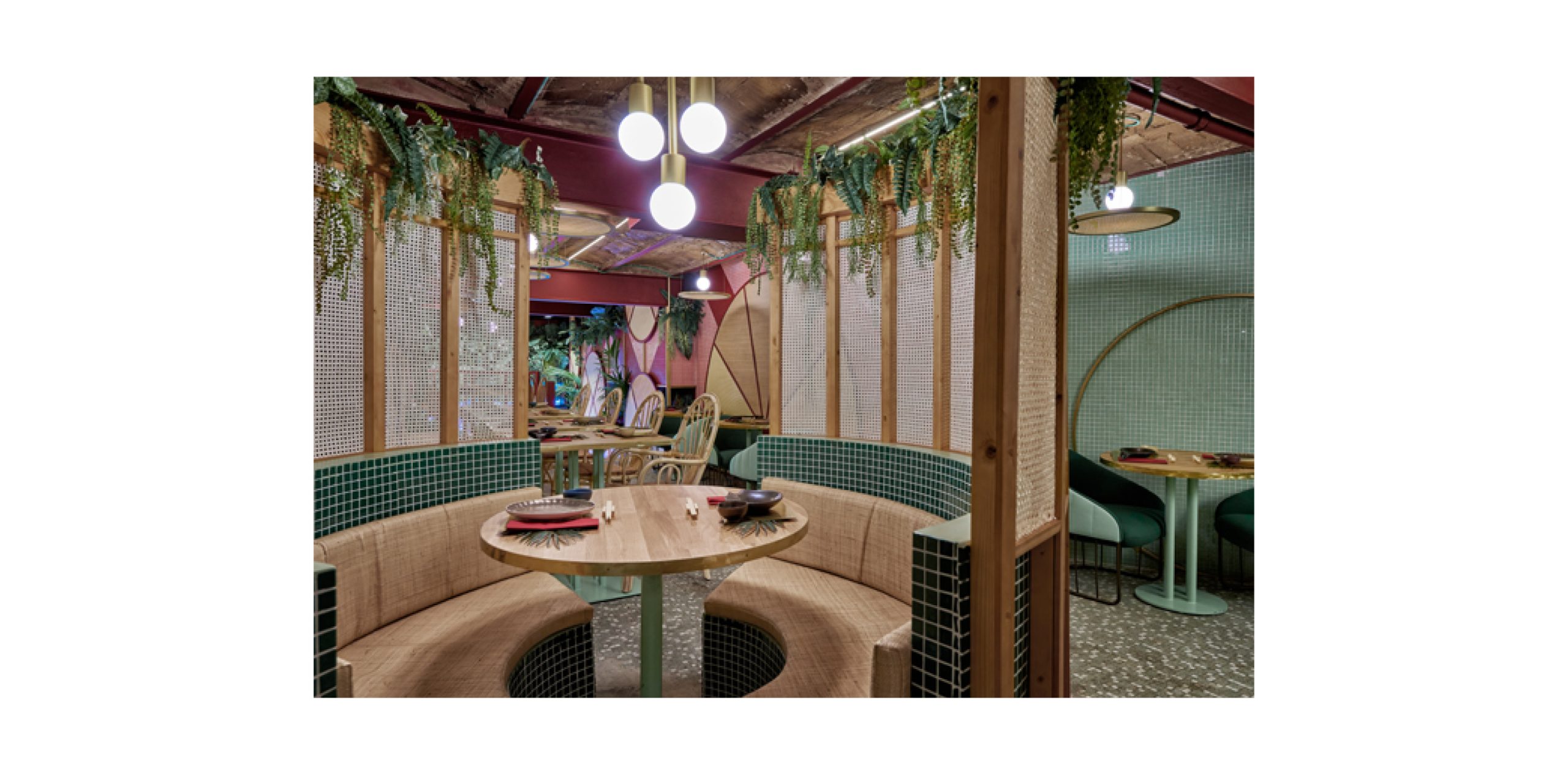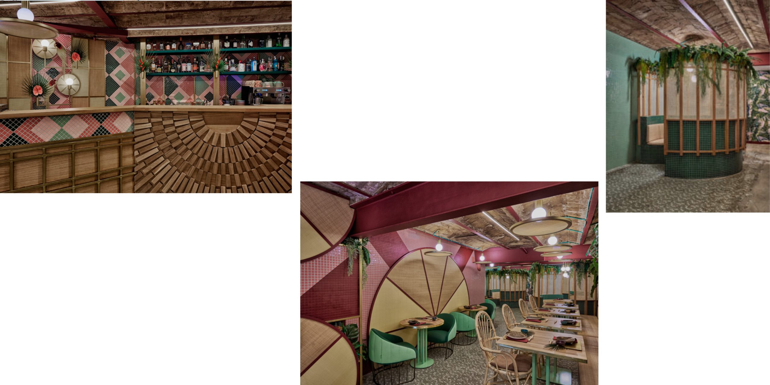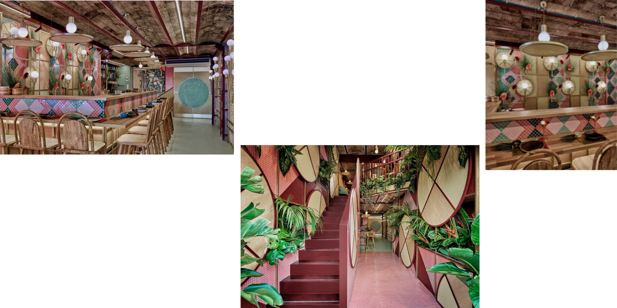 The designers maintained the existing elements like the vaults, metallic beams and original bricks of the venue in its actual state to highlight the beauty of its imperfections left by time. On entering the restaurant, you are welcomed by the raffia circles inspired by the hats used during the rice collection in the land of the rising sun merged with the vibrant coloured mosaic tiles and tropical plants—reminiscent of the samba land.