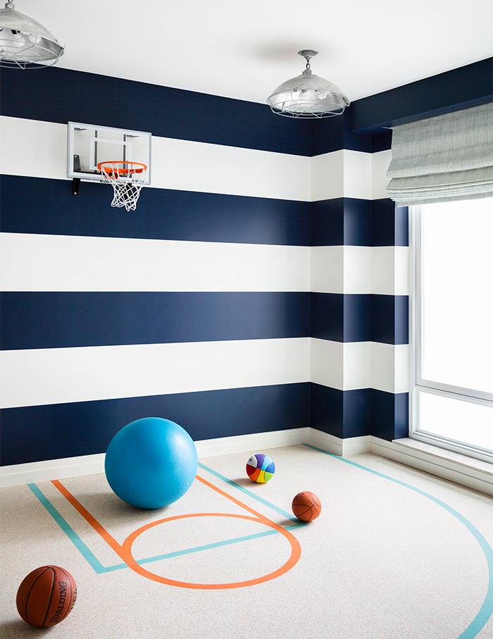 We’re big fans of the apartment’s playroom—painted in bold horizontal stripes of marine blue and white, with a resilient gym flooring. Featuring a small indoor basketball court, the opposite end houses a sectional sofa and TV making it a screening room.