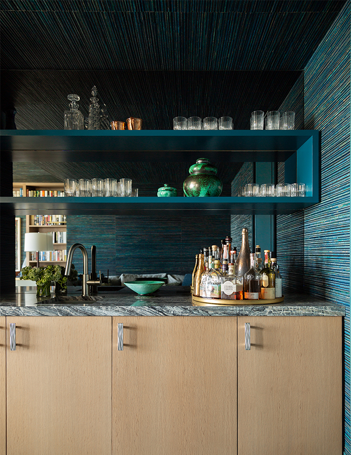 The wet bar in the den complements the wall covering from Eltis; Photographs by Brittany Ambridge