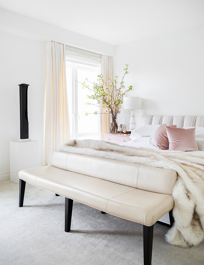 The master suite features a Holly Hunt Angelika King Bed with channelled headboard, a bench from Promemoria in a Moore & Giles leather and a rug from Stark Carpets. Soft furnishings are from Arabelle Taggart, Fine Linens and Restoration Hardware; Photographs by Brittany Ambridge
