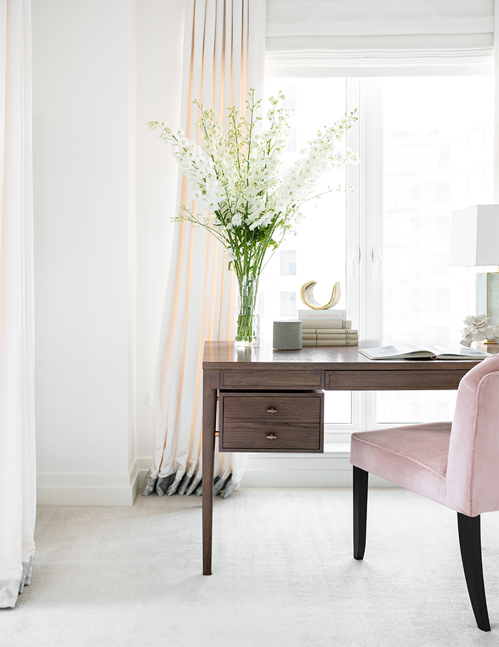 The bedroom also houses a study with an oak desk with brass knobs from Dennis Miller and a chair in Dedar fabric from Soane; Photographs by Brittany Ambridge