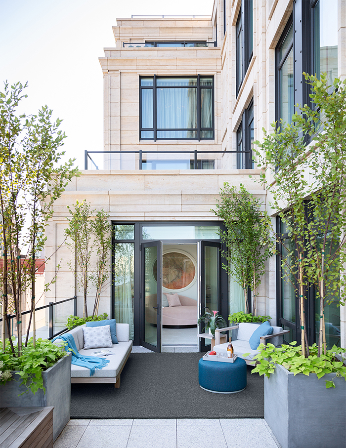 The outdoor terrace uses premium teak furniture from Janus Et Cie in Pierre Frey fabric, blue stools from Walter’s Wicker, chrome sculptures from Jamali Floral & Garden, and Carrera marble top and powder coat base coffee tables from Sutherland; Photographs by Brittany Ambridge