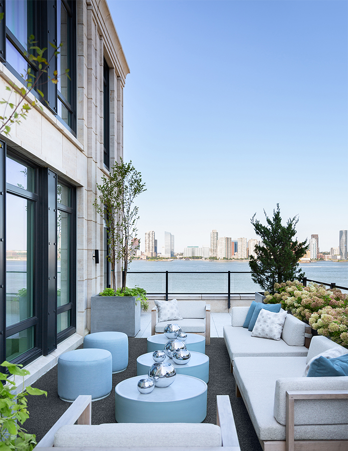 We can’t help but hum Billy Joel’s New York State of Mind as we take in the magnificent view of the Hudson River. A central back sofa and fireplace face the river, while accent chairs in deep blue hues and an oval rug lend colour to the space.