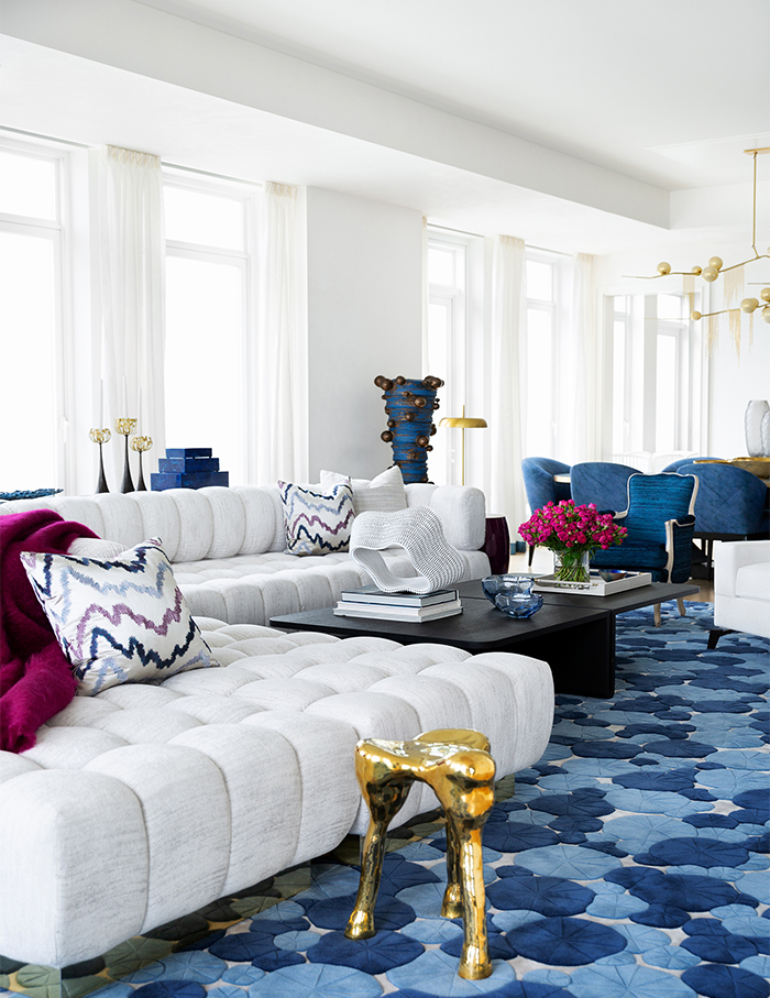 The living room sofa comes with a mirror-polished bronze base from Todd Merrill and is upholstered in a Romo fabric. Also seen are a white lounge chair from Holly Hunt and bronze side table by Franck Evennou Taro from Maison Gerard; Photographs by Brittany Ambridge