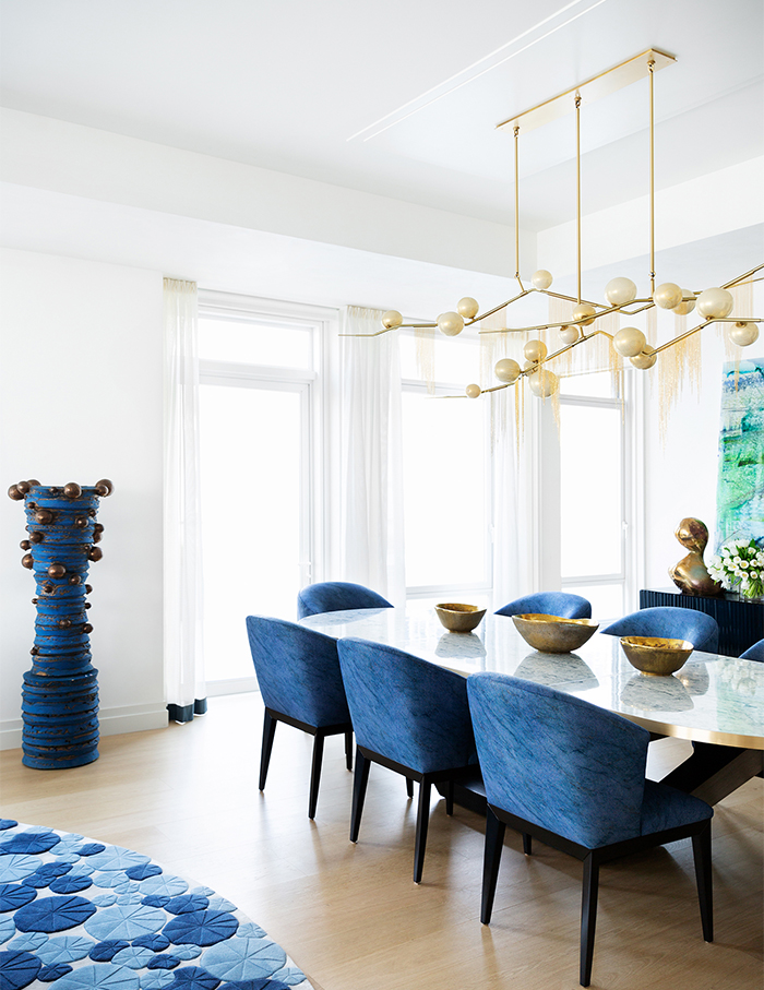 The foyer leads to a white and blue, living-cum-dining space with a hint of gold accents. A custom racetrack oval dining table paired with rich cobalt shagreen chairs, embossed in leather characterise the space. A lacquer buffet as well as a monumental ceramic sculpture by Peter Lane add a jewel toned pop to the room, while a custom cherry bomb fixture by Lindsey Adelman hangs above.