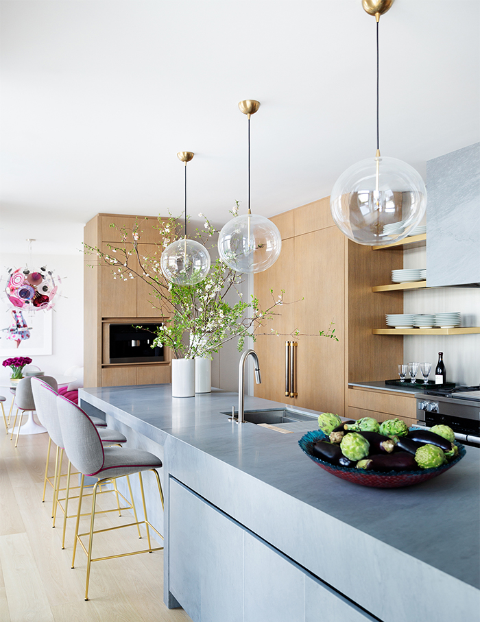The kitchen features RH Modern Glass glove mobile pendant and Gubi Beetle Counter Chairs from Suite NY upholstered in a Jerry Pair leather with contrast trim to match the banquette; Photographs by Brittany Ambridge