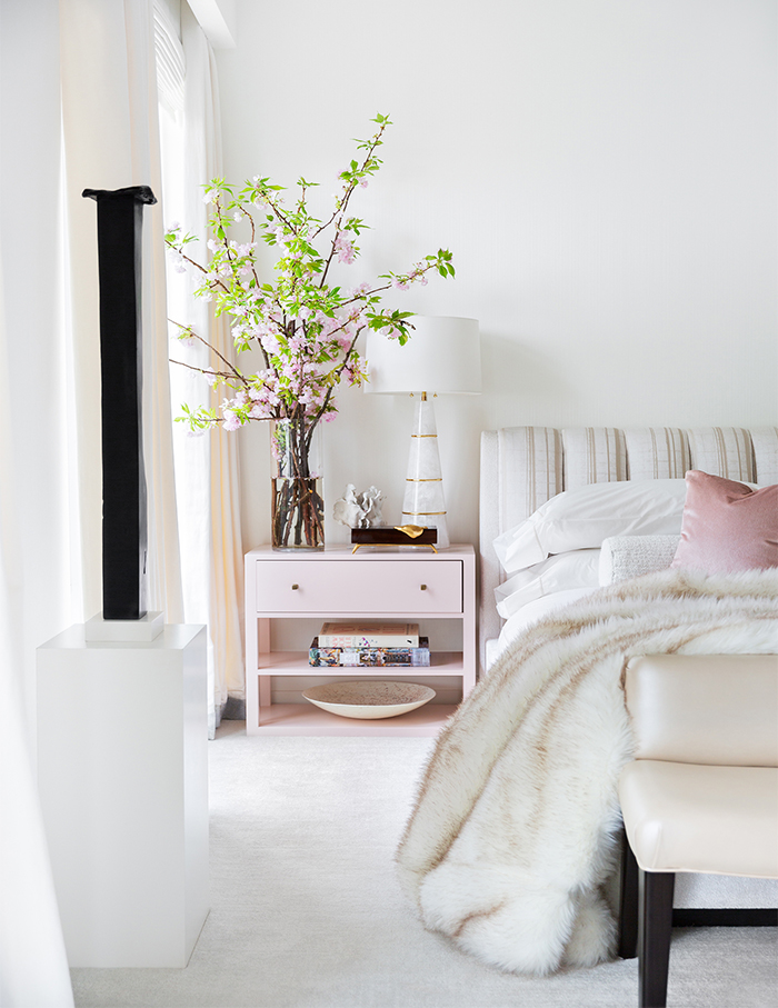 Designed by Drake/Anderson, a satin lacquer nightstand is decorated with a natural brass and quartz bedside lamp from Circa Lighting; Photographs by Brittany Ambridge