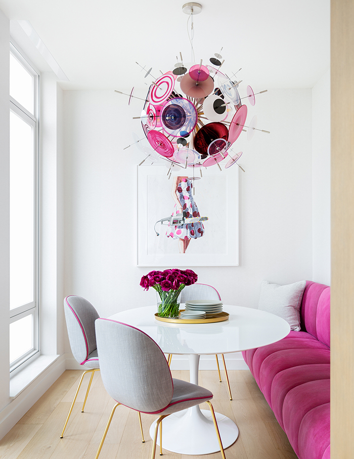 Inside, the kitchen is situated off the dining area and also features a breakfast nook equipped with a bright pink channelled leather banquette. A classic Saarinen oval dining table is paired with comfortable seating jauntily piped in pink, matching the counter stool, while a knockout glass chandelier illuminates the space.