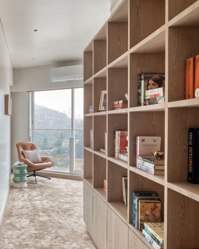 The home unfolds through two expansive living rooms, stitched together by marble flooring with delicate brass inlay that travels like a current underfoot. When the afternoon light hits just right, the stone’s subtle grooves surface. A fluted wooden panel acts as a gentle threshold between the public and private realms, guiding one from conversation-heavy lounges into the contemplative calm of the mandir, library and master bedroom. A fluid wall between the formal and family living spaces doubles as a projection screen, turning movie nights into a weekly ritual. It’s in these gestures that the house finds character: rooms that know how to host Diwali gatherings and Sunday reruns with equal grace.
