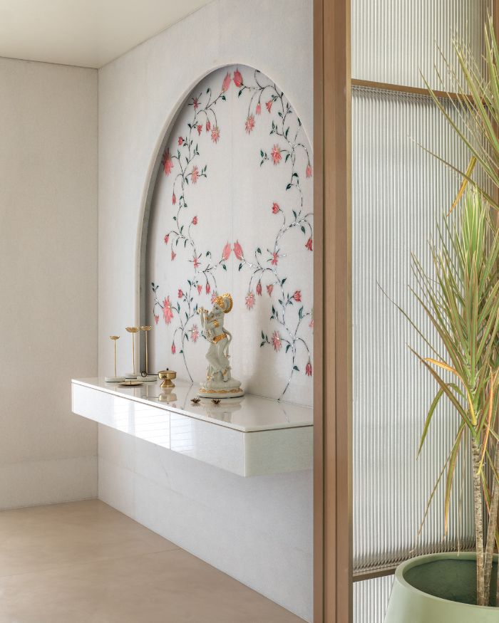 The home unfolds through two expansive living rooms, stitched together by marble flooring with delicate brass inlay that travels like a current underfoot. When the afternoon light hits just right, the stone’s subtle grooves surface. A fluted wooden panel acts as a gentle threshold between the public and private realms, guiding one from conversation-heavy lounges into the contemplative calm of the mandir, library and master bedroom. A fluid wall between the formal and family living spaces doubles as a projection screen, turning movie nights into a weekly ritual. It’s in these gestures that the house finds character: rooms that know how to host Diwali gatherings and Sunday reruns with equal grace.